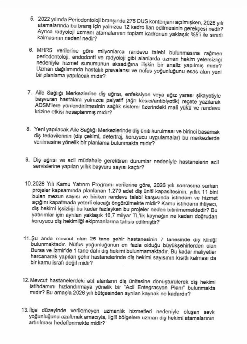 Önerge hakkında sosyal medyada paylaşım yapan Özdağ, “Diş Hekimleri Türkiye’de ağız ve diş sağlığı hizmetlerinde ciddi bir planlama sorunu yaşanmaktadır. Bir yanda kamuda atanmayı bekleyen diş hekimleri, diğer yanda aylar sonrasına verilen randevular nedeniyle tedavi olamayan vatandaşlarımız bulunmaktadır. Yaklaşık 20 bin diş hekiminin başvuru potansiyeline karşılık 2026 yılı ilk defa ve yeniden atama kurasında yalnızca 521 kadro ilan edilmesi, meslekte ciddi bir istihdam ve hizmet krizine yol açmış durumdadır. Konu ile ilgili Sağlık Bakanlığı’na soru önergesi verdim. Cevabı aşağıdaki bağlantı üzerinden hep birlikte takip edelim” ifadelerine yer verdi. (BSHA / Bilim ve Sağlık Haber Ajansı)